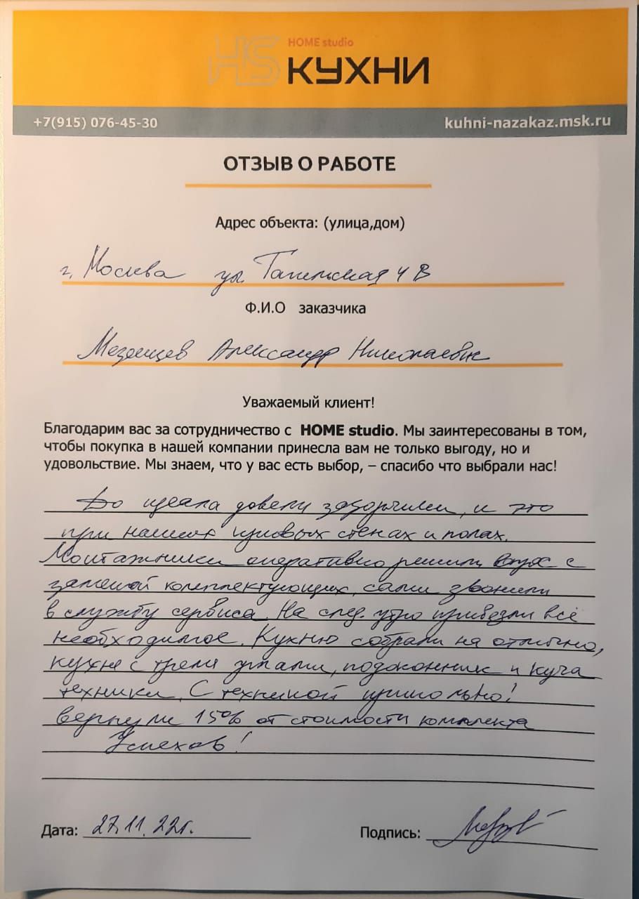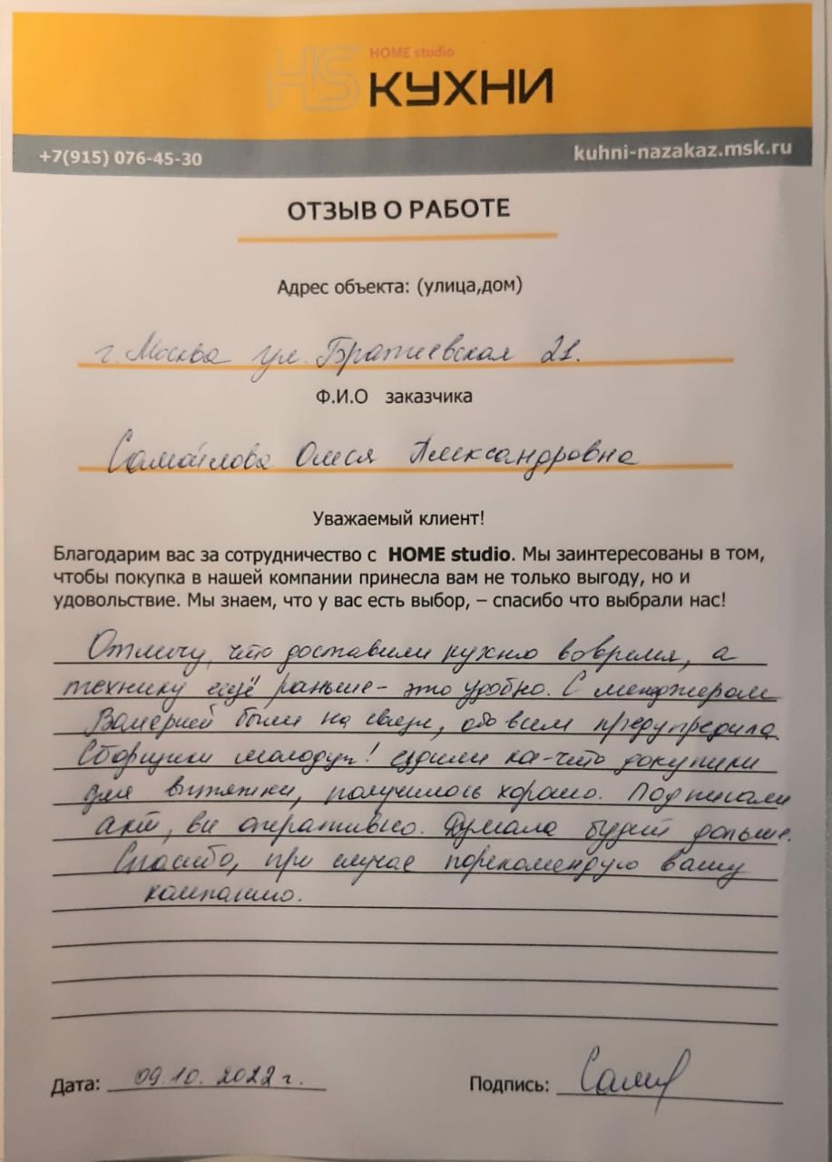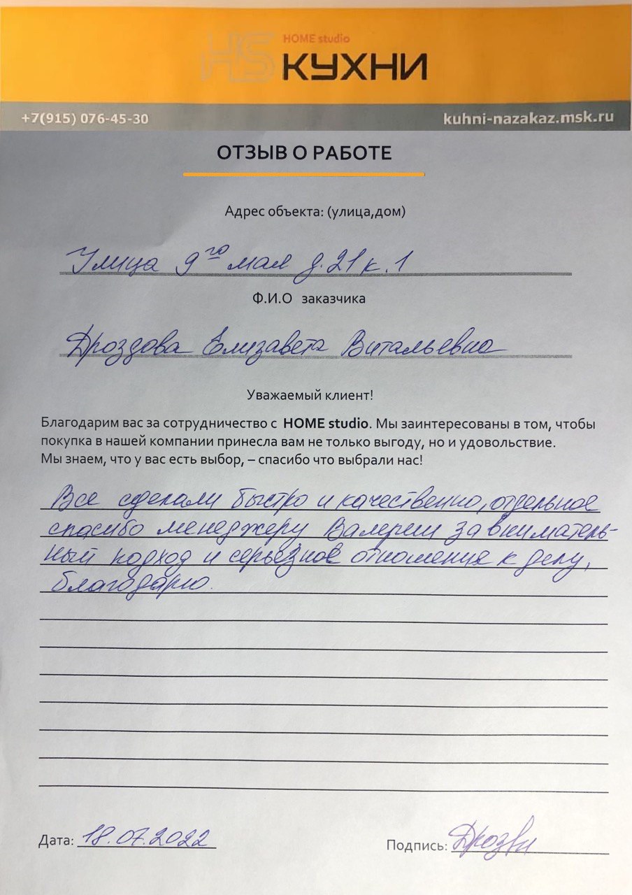 Вызвали дизайнера консультанта к нам домой, была удивлена большим выбором материалов по кухне и шкафам, после долгих согласований с мужем выбрали нужные цвета, как и обещали срок изготовления кухни составил две недели, привезли все вовремя, но мы ещё не успели доделать ремонт, монтаж начали через три недели, выполнили все качественно, нам очень нравится.