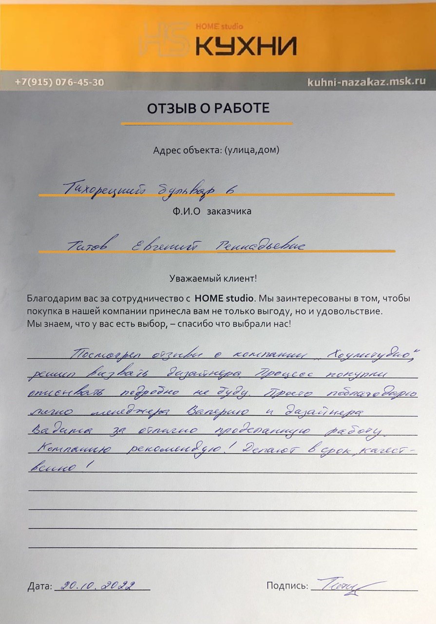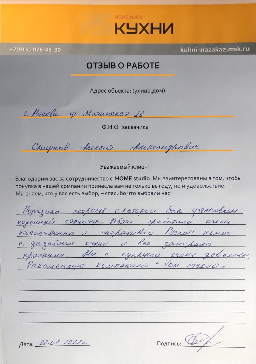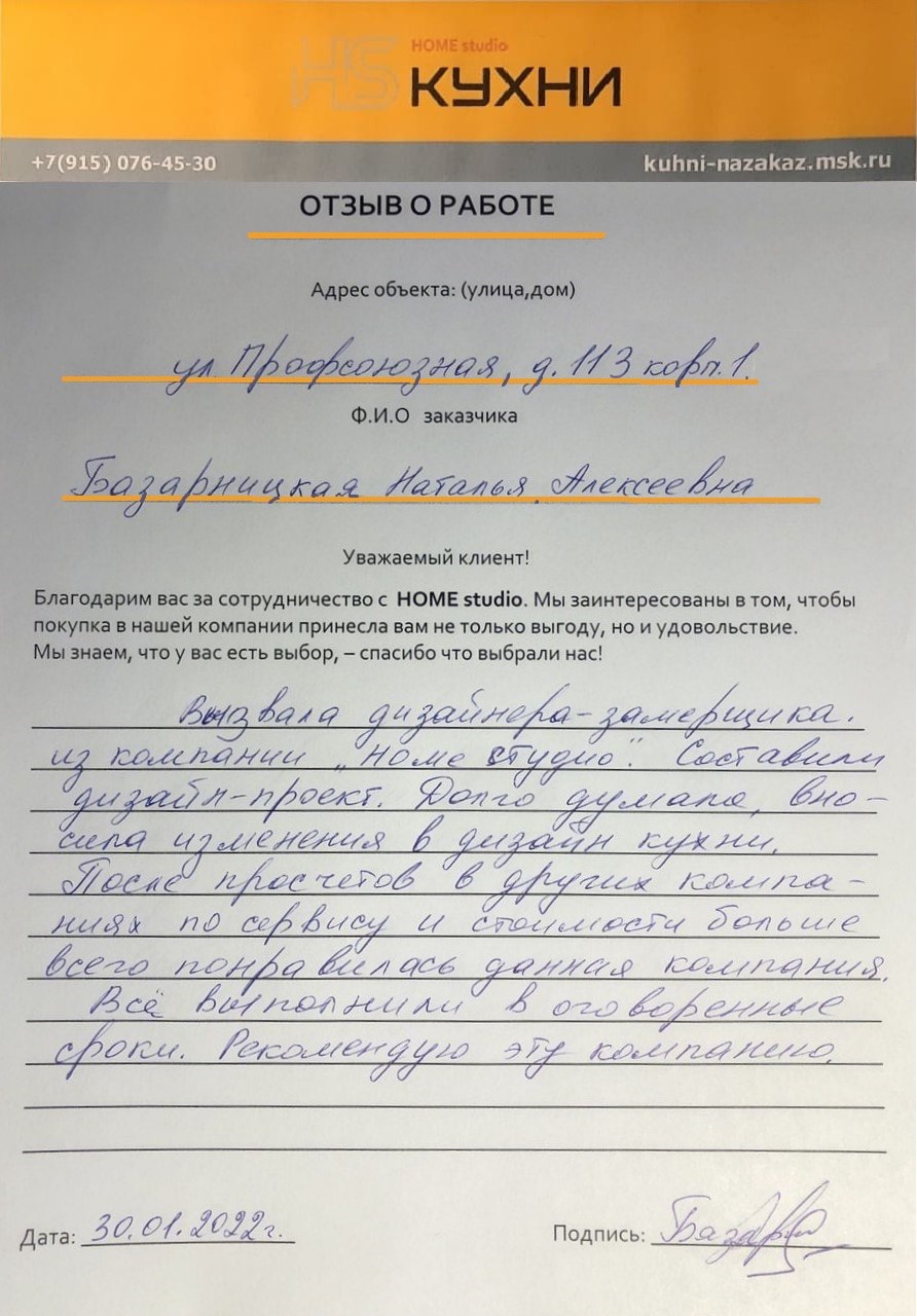 Вызвали дизайнера консультанта к нам домой, была удивлена большим выбором материалов по кухне и шкафам, после долгих согласований с мужем выбрали нужные цвета, как и обещали срок изготовления кухни составил две недели, привезли все вовремя, но мы ещё не успели доделать ремонт, монтаж начали через три недели, выполнили все качественно, нам очень нравится.